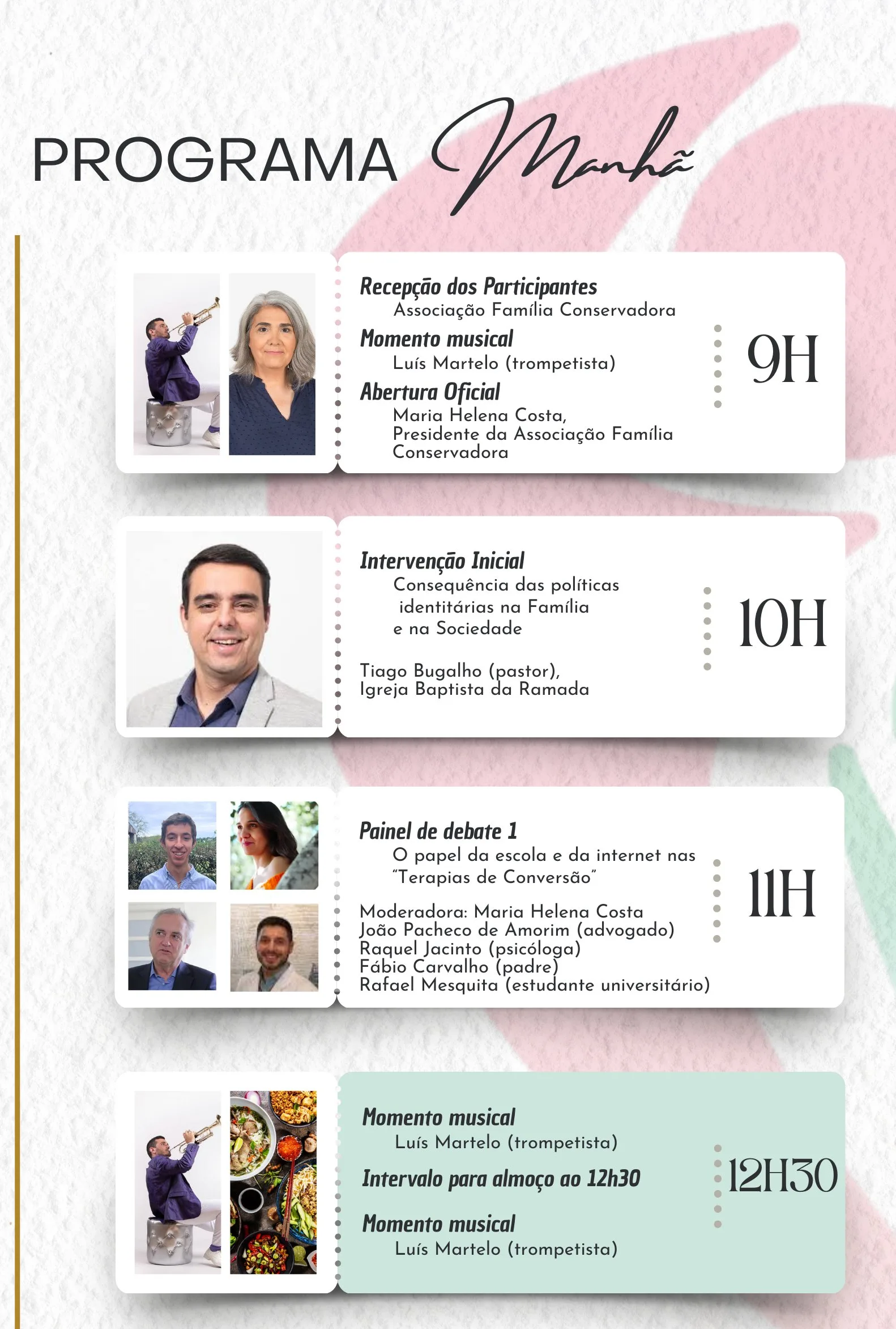 O evento contará com a participação de oradores de diversas áreas da sociedade civil: da religião (Pr. Tiago Bugalho); da política e do ensino (Bruno Fialho, Miguel Corte Real e José de Carvalho); da saúde (Mariana Nina), e de profissionais liberais como o advogado João Pacheco de Amorim e a psicóloga Raquel Jacinto. O encontro contará ainda com a participação do trompetista português, Luís Martelo.