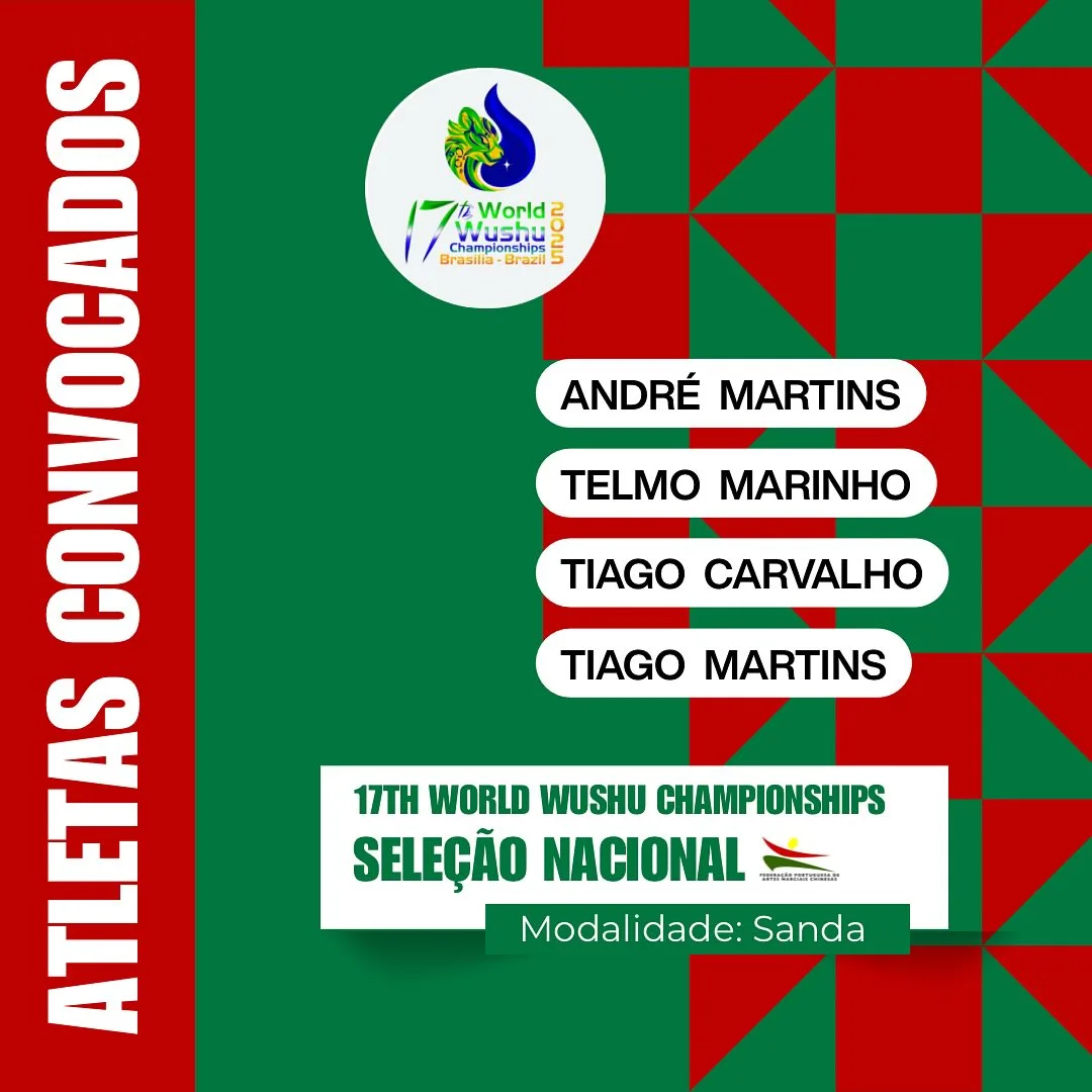 Os atletas Tiago Martins (Meadela, Viana do Castelo), André Martins, Telmo Marinho e Tiago Carvalho da Seleção Nacional de Sanda, foram oficialmente convocados pela Federação para representar Portugal no 17th World Wushu Championships, que terá lugar em Brasília, Brasil, de 31 de Agosto a 8 de Setembro de 2025.