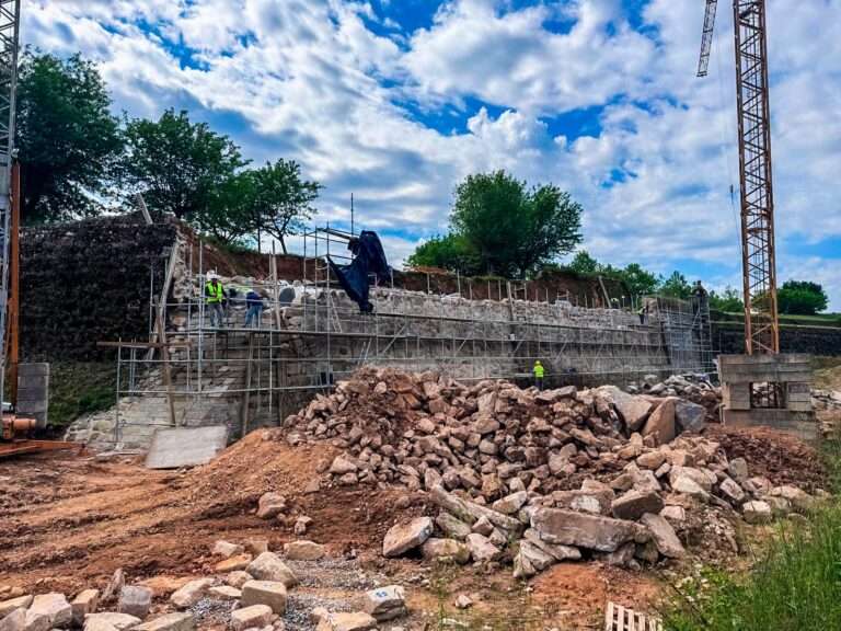 Os trabalhos avançam com o rigor que um monumento classificado exige. Neste momento, decorre a reconstrução do segundo pano de muralha, localizado no tardoz da cortina, paralelamente aos trabalhos de aterro da vala de fundação, operações técnicas essenciais para garantir a estabilidade e durabilidade da estrutura. Também se está a proceder à recolocação do friso e restante aparelho que remata o topo superior do pano da primeira cortina.