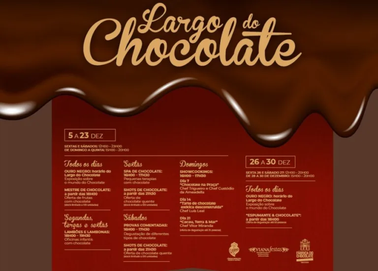 No âmbito da iniciativa “Viana Coração do Natal”, o Largo Maestro José Pedro transforma-se num verdadeiro Largo do Chocolate, com programação que inclui não só o doce chocolate, mas também exposição, oficinas infantis, showcookings e degustações.