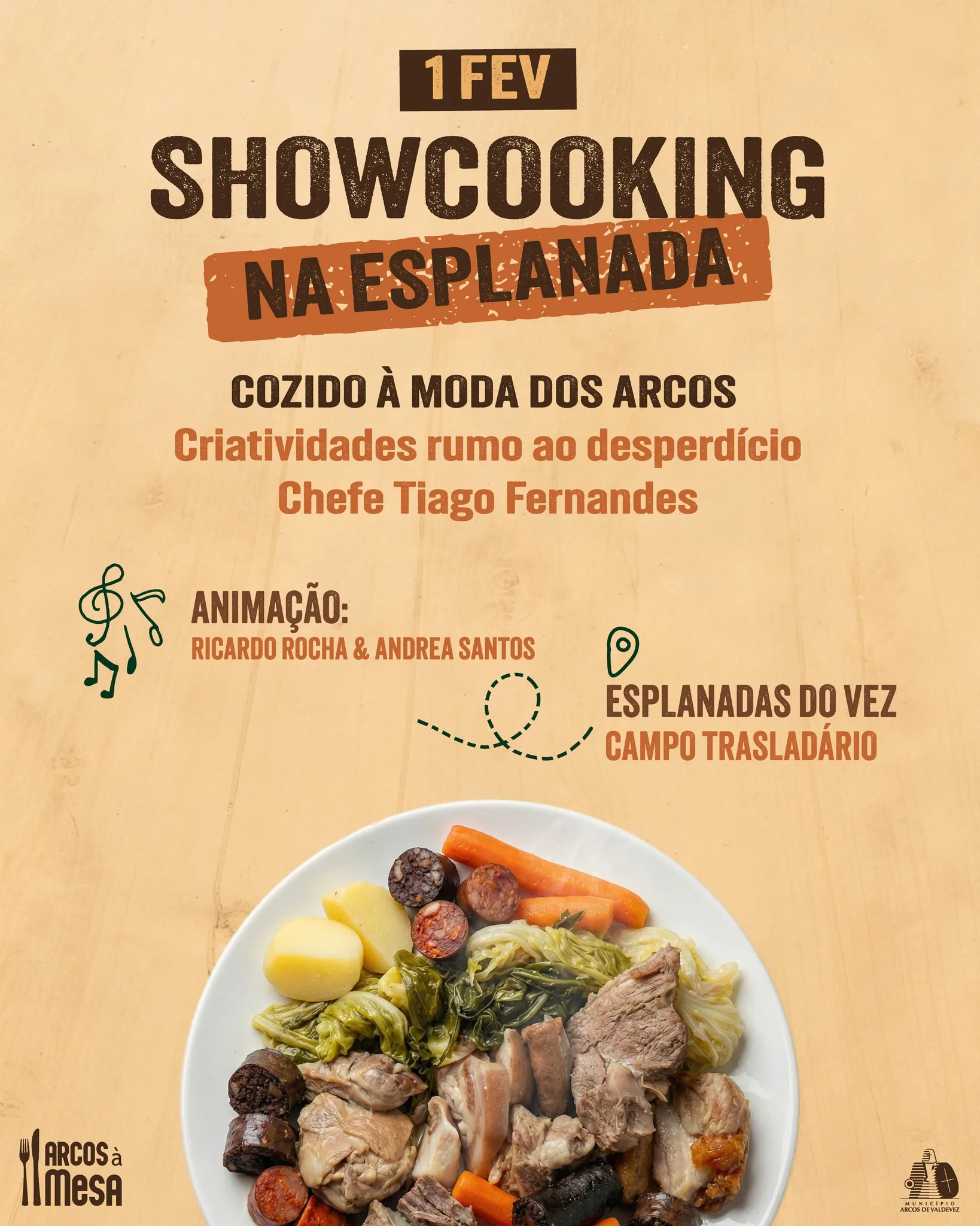 As Esplanadas do Vez, no Campo do Trasladário, recebem, no próximo domingo, a partir das 11h00, o primeiro showcooking do ano, integrado no evento Arcos à Mesa, que está de